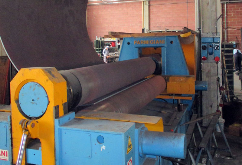 Disponiamo di una calandra Parmigiani con capacità di piega di 3000mm (utile) per spessore 40 mm con raggio 2000 mm con possibilità di produrre coni con rulli di diametro 400 mm.